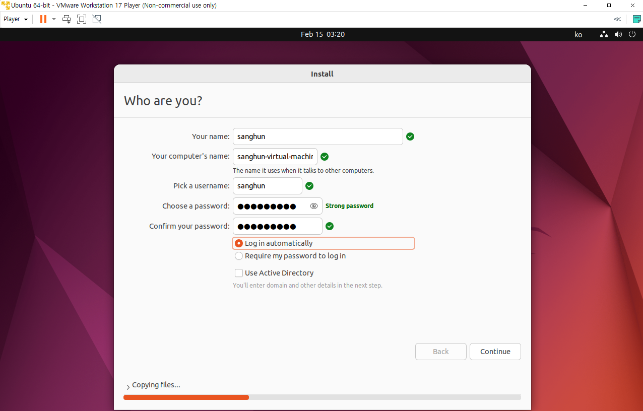 VM환경에서만 사용할 것이기 때문에 자동로그인을 되도록 설정하고, Active Directory 또한 필요치 않기 때문에 선택하지 않고 진행하도록 하겠습니다.