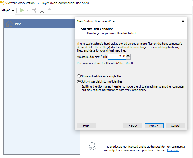 Store virtual disk as a single file 과 Split virtual disk into multiple files는 가상머신의 구성하는 단위를 말하는데 성능상 싱글이 좋기 떄문에 싱글로 선택하도록 하겠습니다.