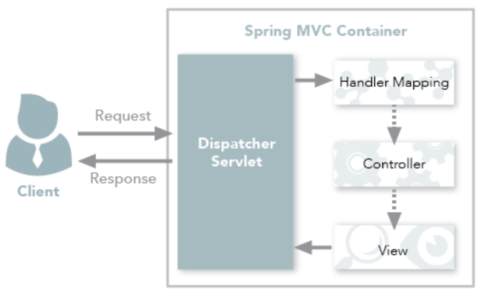 Spring MVC는 MVC Model2의 발전된 형태로 구성되어 있다. 구성요소 이름 설명 DispatcherServlet 클라이언트의 요청을 받아 컨트롤러에게 전달, 컨트롤러가 리턴한 결과값을 View에 전달하여 알맞은 응답
