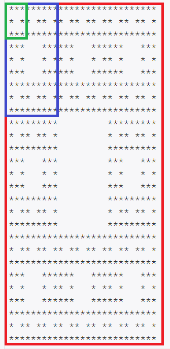 그리고 별찍기의 특성상 별이 그려지면 탈출을 시켜주고 해당영역이 별이 찍히는지 여부가 판단이 안되면 재귀로 좀더 작은 형태에서 문제를 확인하면 됨을 알 수가 있다.