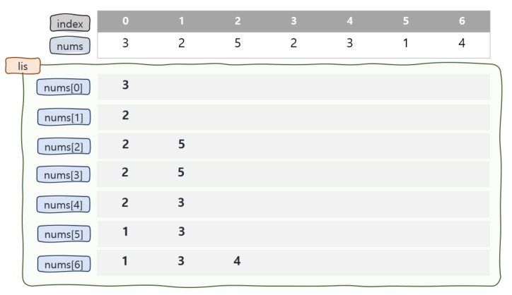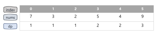 즉, db[i]의 테이블은 nums[i]>nums[0~i-1], dp[i]에 저장된 길이와 앞의 조건을 만족하는 인덱스에 해당하는 dp의 값 + 1 중 큰 값을 저장하면 된다.