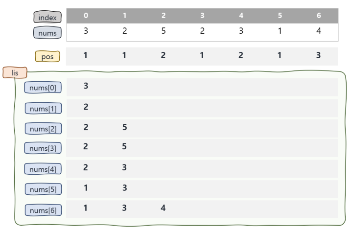 위 그림을 보면 각 요소가 lis테이블에 위치할때의 인덱스를 pos 테이블에서 관리를 하게 된다.