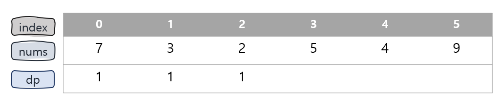 하지만 index=3의 경우를 보면 nums[3]은 nums[1], nums[2]의 값보다 크다. 따라서 그경우 dp[3]의 값이 dp[1]+1, dp[2]+1보다 큰 값을 저장해주면 된다.