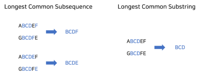 Longest Common Sub-sequence 불린다. 여기서 string이 아닌 sequence는 사용하는 이유는 각 단어가 갖는 개념적 의미가 다르기 때문이다.
