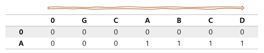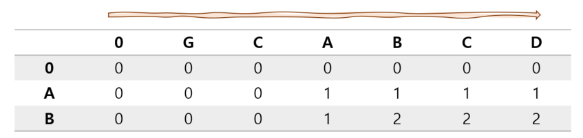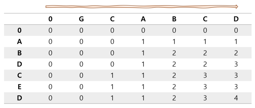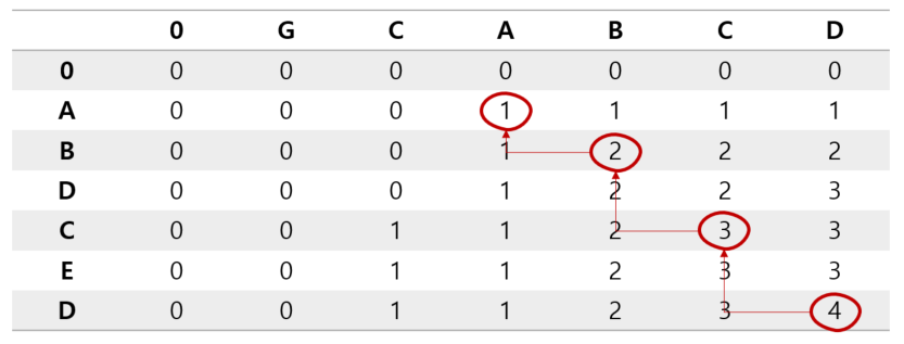 위 그림에서 보다시피 {GCA}, {GCAB}, {GCABC}, {GCABCD}와 {A}를 비교하면 공통 수열이 1임을 알수 있다.