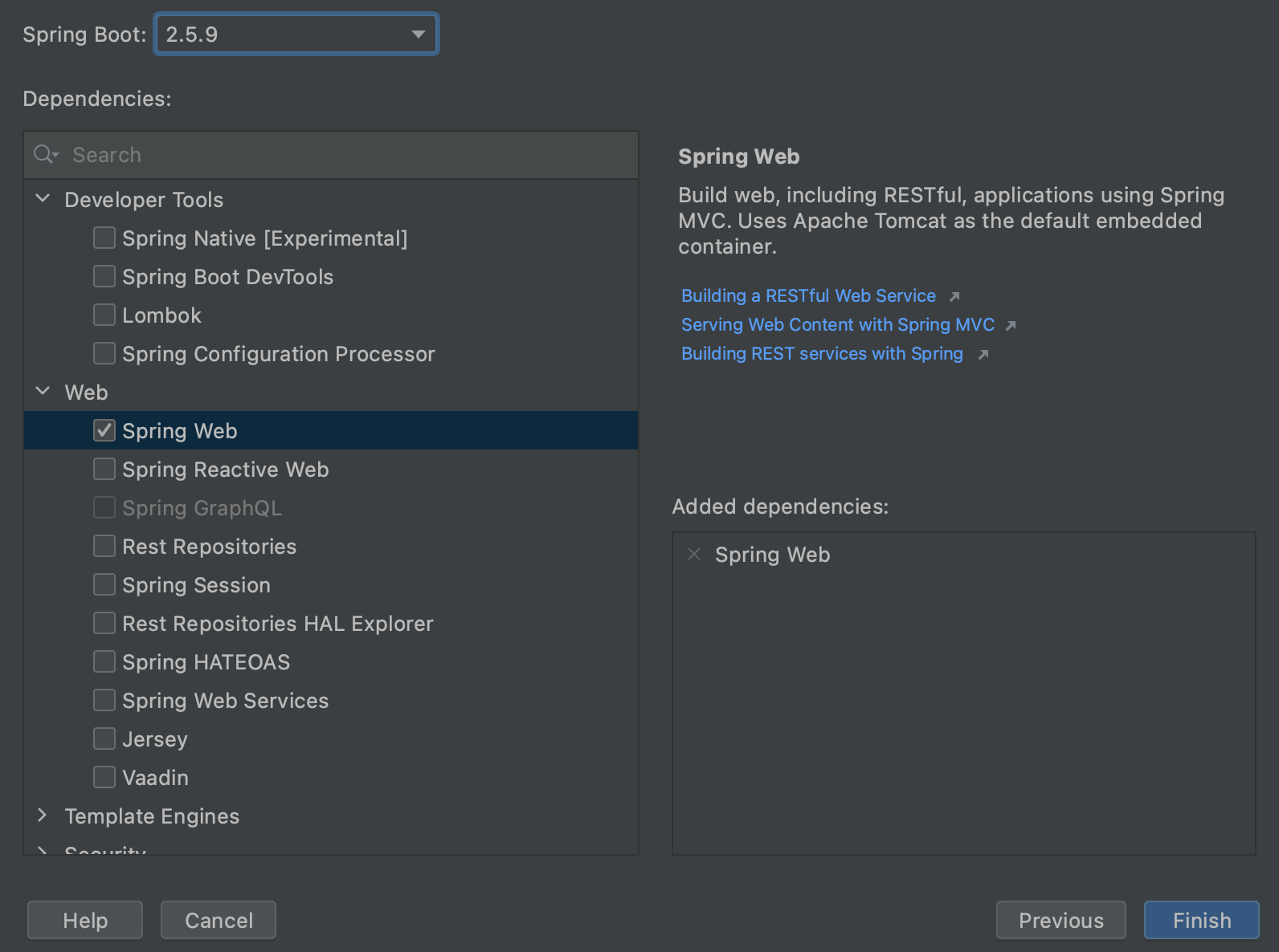 spring web을 선택해주면 기본적으로 RESTful Api를 위한 디펜던시를 알아서 추가해주기 때문에 편리하게 세팅할 수 있다.