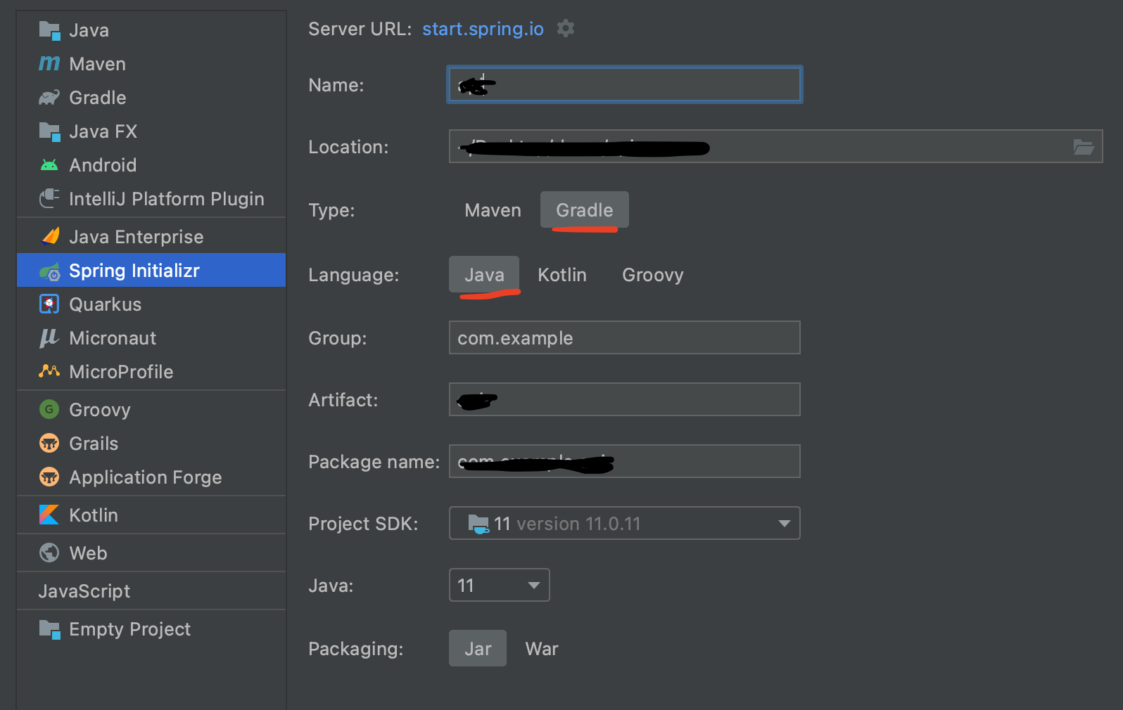Gradle를 사용할 거기 때문에 Gradle로 설정해주고 언어는 Java를 선택해주면된다