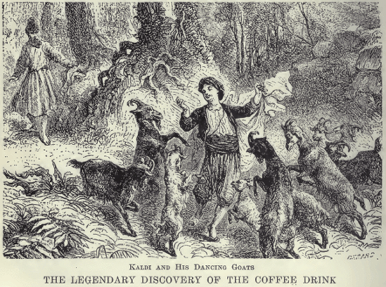 에티오피아 고산지역에 살던 '칼디'라는 목동은 염소들이 밤에 잠을 자지 않고 흥분해 있는 것을 보고 이상하게 생각하다가 염소들이 낮에 수풀 근처에 있던 빨간색 열매를 먹었다는 사실을 기억해 냈다. 다음 날 칼디도 호기심에 그 빨간 열매를 먹었더니 정신이 맑아지면서 흥분상태가 되어 자신이 기르던 염소들과 같이 춤을 추었다고 하며 이 빨간색 열매의 효능이 그 지역의 수도승인 '스키아들리'에게 알려졌는데 그는 기도 중에 깨어 있기 위한 목적으로 빨간색 열매. 즉, 커피열매를 뜨거운 물에 넣고 끓인 다음 마셨다고 한다.