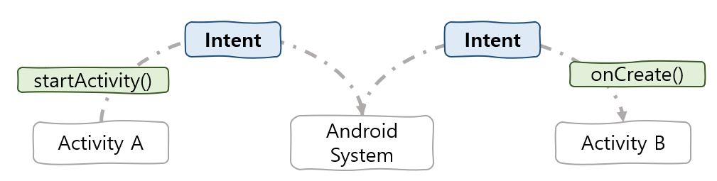 인텐트는 어플리케이션의 구성요소 즉, 앱 컴포넌트간의 작업수행을 위한 정보를 전달하는 역할을 합니다.