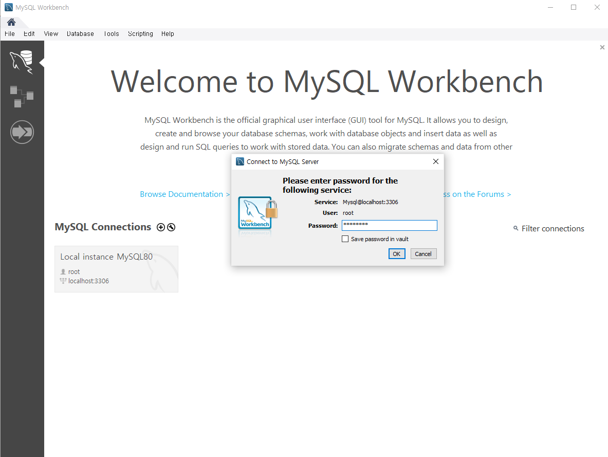 만약, 설치가 성공적으로 되었다면 'MySQL Workbench'가 실행될 것이다.